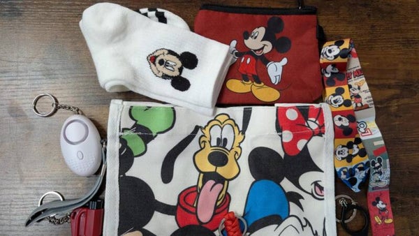 small Mickey Mouse canvas bag, with coin purse. Alarm, kitty knuckles, pom,waterproof pill holder, chapstick holder, monkey ball, mickey socks, seatbelt cutter (3 way), window breaker, and Mickey lanyard. awesome 16 piece set! great for kids.